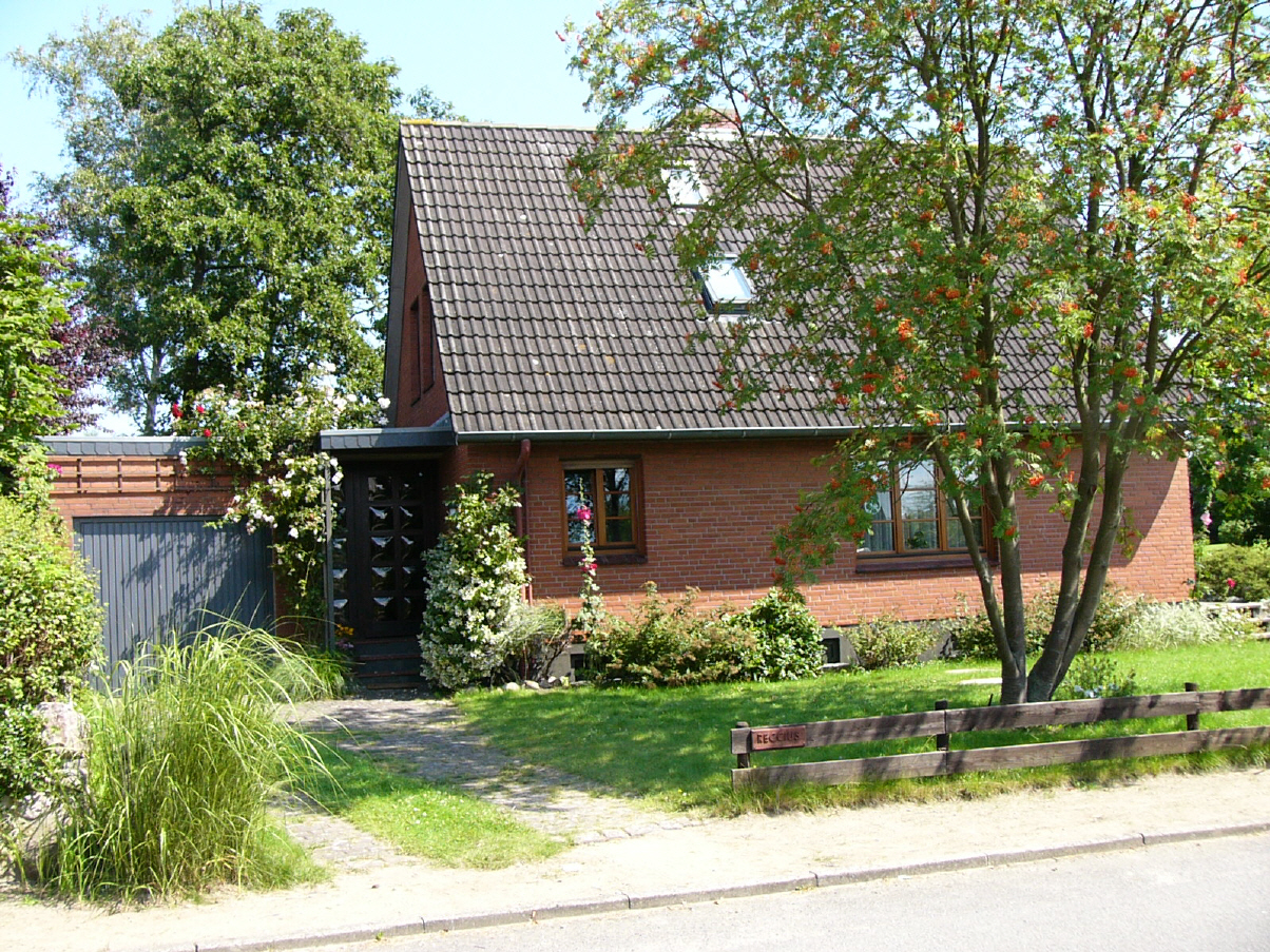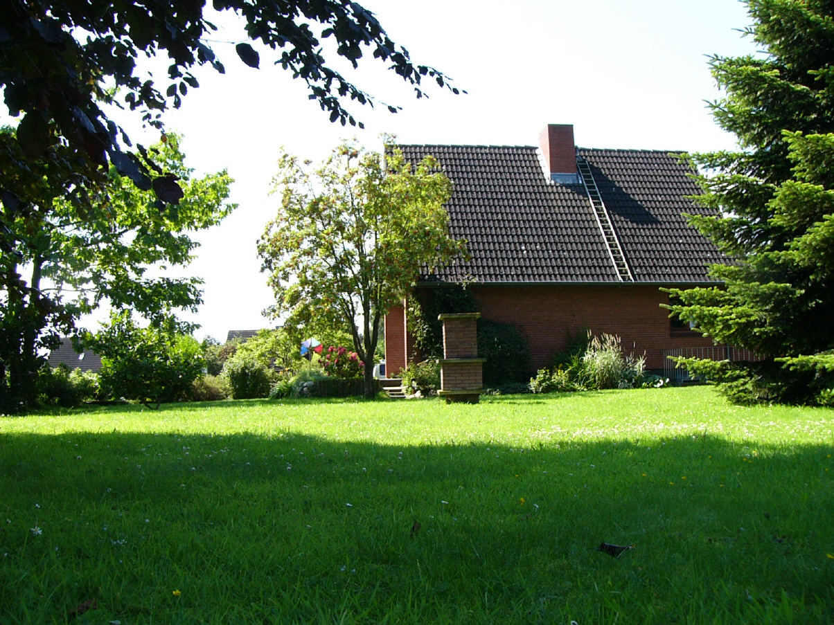 Das Haus ist umgeben von ca. 1000 qm Rasengrundstück mit niedrigem Holzzaun begrenzt. Hinter dem Haus befindet sich inmitten der Wiese ein gemauerter Grill. Verschiedene Bäume, Büsche und Sträucher geben ein wenig Sicht- und Windschutz. Die am Haus vorbeiführende Nebenstraße ist im Wesentlichen nur von den Anwohnern und den Tagesgästen befahren und eignet sich auch gut zum Spielen und Radfahren für Kinder. In Richtung Schleiufer ist eine große öffentliche Spielwiese mit Fußballtor. Am Schleiufer ist eine unbewachte Badestelle mit Sand, Sitzbänken, und viel Platz für Badematten. Das Ufer ist schön flach, dass dort auch Kleinkinder unter Aufsicht im Uferbereich spielen können. Von der Terasse aus hat man den Sandkasten gut im Blickfeld. Terassen- und Gartenmöbel, Klappstühle, Liegestühle und Sonnenschirm liegen im ersten Kellerraum zur Ihrer Verfügung, ein paar zusätzliche Wolldecken und Sitzkissen liegen im Haus in der Treppennische hinterm Kamin zur Benutzung bereit.